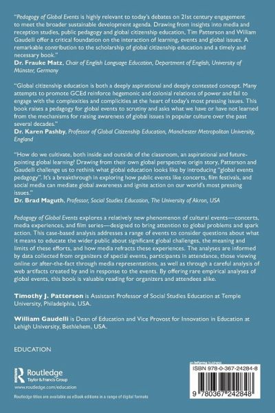 "Pedagogy of Global Events is highly relevant to today's debates on 21 st century engagement to meet the broader sustainable development agenda. Drawing from insights into media and reception studies, public pedagogy and global citizenship education, Tim Patterson and William Gaudelli offer a critical foundation on the interaction of learning, events and global issues. A remarkable contribution to the scholarship of global citizenship education and a timely and necessary book."
