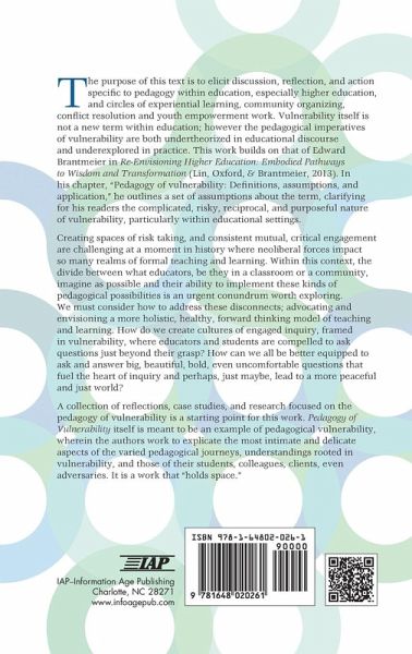 The purpose of this text is to elicit discussion, reflection, and action specific to pedagogy within education, especially higher education, and circles of experiential learning, community organizing, conflict resolution and youth empowerment work. Vulnerability itself is not a new term within education; however the pedagogical imperatives of vulnerability are both undertheorized in educational discourse and underexplored in practice. This work builds on that of Edward Brantmeier in Re-Envisioning Higher Education: Embodied Pathways to Wisdom and Transformation (Lin, Oxford, & Brantmeier, 2013). In his chapter, "Pedagogy of vulnerability: Definitions, assumptions, and application," he outlines a set of assumptions about the term, clarifying for his readers the complicated, risky, reciprocal, and purposeful nature of vulnerability, particularly within educational settings. Creating spaces of risk taking, and consistent mutual, critical engagement are challenging at a moment in history where neoliberal forces impact so many realms of formal teaching and learning. Within this context, the divide between what educators, be they in a classroom or a community, imagine as possible and their ability to implement these kinds of pedagogical possibilities is an urgent conundrum worth exploring. We must consider how to address these disconnects; advocating and envisioning a more holistic, healthy, forward thinking model of teaching and learning. How do we create cultures of engaged inquiry, framed in vulnerability, where educators and students are compelled to ask questions just beyond their grasp? How can we all be better equipped to ask and answer big, beautiful, bold, even uncomfortable questions that fuel the heart of inquiry and perhaps, just maybe, lead to a more peaceful and just world? A collection of reflections, case studies, and research focused on the pedagogy of vulnerability is a starting point for this work. The book itself is meant to be an example of pedagogical vulnerability, wherein the authors work to explicate the most intimate and delicate aspects of the varied pedagogical journeys, understandings rooted in vulnerability, and those of their students, colleagues, clients, even adversaries. It is a work that "holds space."