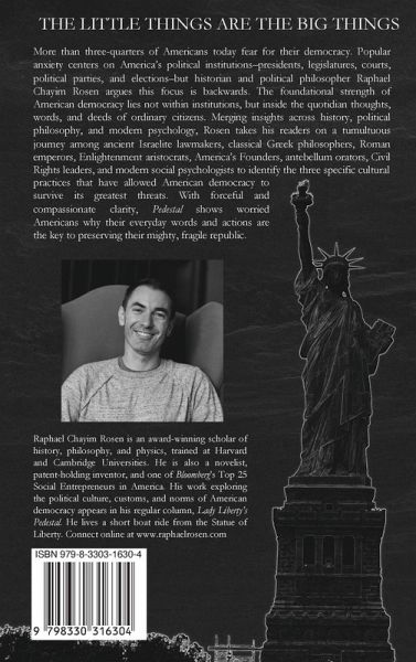 More than three-quarters of Americans today, from all across the political spectrum, fear for their democracy. While most popular attention centers on America's political institutions-presidents, legislatures, courts, political parties, & elections-historian, entrepreneur, and political philosopher Raphael Chayim Rosen argues this approach is upside down. The foundational strength of American democracy does not lie within institutions beyond the reach of ordinary Americans, but rather inside the quotidian thoughts, words, and deeds of citizens themselves. Merging insights across history, political philosophy, and modern psychology, Rosen takes his readers on a tumultuous journey through ancient Israelite legislators, classical Greek philosophers, Roman emperors, Enlightenment aristocrats, America's Founders, antebellum orators, Civil Rights leaders, and modern social psychologists to identify the specific cultural practices that have made American democracy survive its greatest threats. With forceful and compassionate clarity, Pedestal shows why Americans' everyday words and actions are the key to preserving their mighty, fragile democracy.