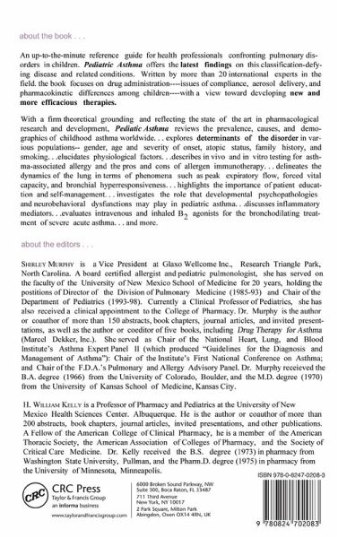 An up-to-the-minute reference guide for health professionals confronting pulmonary disorders in children, Pediatric Asthma offers the latest findings on this classification-defying disease and related conditions. Written by more than 20 international experts in the field, the book focuses on drug administration-issues of compliance, aerosol delivery, and pharmacokinetic differences among children-with a view toward developing new and more efficacious therapies. Provides cutting-edge analysis for more effective diagnosis of children with asthma and improved monitoring and treatment for chronic patients! With a firm theoretical grounding and reflecting the state of the art in pharmacological research and development, Pediatric Asthma reviews the prevalence, causes, and demographics of childhood asthma worldwide explores determinants of the disorder in various populations-gender, age and severity of onset, atopic status, family history, and smoking elucidates physiological factors such as airway remodeling, airway hyperresponsiveness, and persistent inflammation describes in vivo and in vitro testing for asthma-associated allergy and the pros and cons of allergen immunotherapy delineates the dynamics of the lung in terms of phenomena such as peak expiratory flow (PEF), forced vital capacity (FVC), and bronchial hyperresponsiveness (BHR) highlights the importance of patient education and self-management investigates the role that developmental psychopathologies and neurobehavioral dysfunctions may play in pediatric asthma discusses inflammatory mediators such as cytokines, chemokines, leukotrienes, and prostaglandins evaluates intravenous and inhaled 2 agonists for the bronchodilating treatment of acute severe asthma and more! Featuring over 2100 references, more than 60 user-friendly tables, and a handy Appendix on clinical monitoring of childhood asthma and recommended drug dosages for its treatment, Pediatric Asthma is an indispensable resource for pediatricians, pediatric pulmonologists, and pediatric pharmacists; clinical allergists and immunologists; general and family practitioners; and graduate and medical school students in these disciplines.