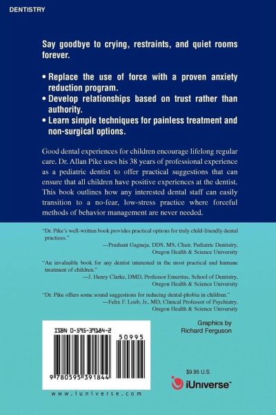 Say goodbye to crying, restraints, and quiet rooms forever. Replace the use of force with a proven anxiety reduction program. Develop relationships based on trust rather than authority. Learn simple techniques for painless treatment and non-surgical options. "Dr. Pike's well-written book provides practical options for truly child-friendly dental practices." -Prashant Gagneja, DDS, MS, Chair, Pediatric Dentistry, Oregon Health & Science University "An invaluable book for any dentist interested in the most practical and humane treatment of children." -J Henry Clarke, DMD, Professor Emeritus, School of Dentistry, Oregon Health & Science University "Dr. Pike offers sound suggestions for reducing dental fears in children, thus insuring they seek routine care as adults." -Felix F. Loeb, Jr., MD, Clinical Professor of Psychiatry, Oregon Health & Science University