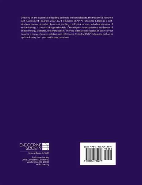 Pediatric Endocrine Self-Assessment Program (Pediatric ESAP) Reference Edition 2023-2024 is a self-study resource designed for endocrinologists seeking initial certification or recertification in pediatric endocrinology, program directors interested in a training instrument, and clinicians and health professionals seeking a self-assessment and broad review of pediatric endocrinology. Pediatric ESAP consists of approximately 100 multiple-choice questions in all areas of pediatric endocrinology, diabetes, growth, and metabolism, with discussion of correct answers, plus references. CME, MOC, online module not included. Updated in alternate years.