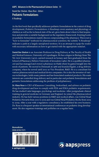 Pediatric Development: Anatomy.- Age, Weight, Body Surface and Stature, Organ Development.- Pediatric Development: Physiology. Enzymes, Drug Metabolism, Pharmacokinetics and Pharmacodynamics.- Pediatric Development - Gastrointestinal.- How to Estimate the Dose to be Given for the First Time to Pediatric Patients.- The Clinical Relevance of Pediatric Formulations.- General Considerations for Pediatric Oral Drug Formulation.- Orosensory Perception.- Flavor Is Not Just Taste: Taste Concealing.- Liquid Formulations.- Paediatric Solid Formulations.- Semi-Solid Formulations.- The Challenge of Automated Compounding.- Pediatric Formulations in Clinical Testing and the Challenge of Final Market Formulation.- Buccal/Sublingual Drug Delivery for the Paediatric Population.- Topical and Transdermal.- Parenteral Liquids for Intravenous and Transdermal Use.- The Challenges of Paediatric Pulmonary Drug Delivery.- Nasal, Ocular and Otic Drug Delivery.- Rectal Drug Delivery.- Intraosseous Infusions in Infants and Neonates.- Compounding for Children - The Compounding Pharmacist.- Food Ingredients.- Excipients and Active Pharmaceutical Ingredients (APIs).- Clinical Testing in Children.- Pediatric Formulations and Dosage Forms and Future Opportunities: Impact of Regulations in the United States and Implementation of Quality by Design.- Pediatric Pharmaceutical Legislation and its impact on Adult and Pediatric Drug Development: The EU Regulatory View.- Pediatric Pharmaceutical Legislation in USA and EU and their impact on Adult and Pediatric Drug Development.- Checks and Balances in the EU: The Role of the European Ombudsman, with a Focus on the Paediatric Regulation.- The Dangerous Business Of Predicting The Future.