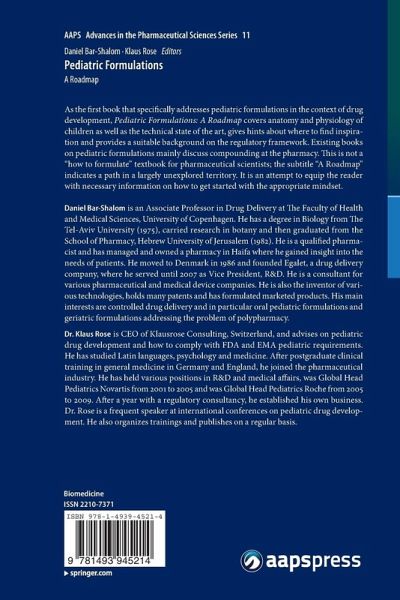 Pediatric Development: Anatomy.- Age, Weight, Body Surface and Stature, Organ Development.- Pediatric Development: Physiology. Enzymes, Drug Metabolism, Pharmacokinetics and Pharmacodynamics.- Pediatric Development - Gastrointestinal.- How to Estimate the Dose to be Given for the First Time to Pediatric Patients.- The Clinical Relevance of Pediatric Formulations.- General Considerations for Pediatric Oral Drug Formulation.- Orosensory Perception.- Flavor Is Not Just Taste: Taste Concealing.- Liquid Formulations.- Paediatric Solid Formulations.- Semi-Solid Formulations.- The Challenge of Automated Compounding.- Pediatric Formulations in Clinical Testing and the Challenge of Final Market Formulation.- Buccal/Sublingual Drug Delivery for the Paediatric Population.- Topical and Transdermal.- Parenteral Liquids for Intravenous and Transdermal Use.- The Challenges of Paediatric Pulmonary Drug Delivery.- Nasal, Ocular and Otic Drug Delivery.- Rectal Drug Delivery.- Intraosseous Infusions in Infants and Neonates.- Compounding for Children - The Compounding Pharmacist.- Food Ingredients.- Excipients and Active Pharmaceutical Ingredients (APIs).- Clinical Testing in Children.- Pediatric Formulations and Dosage Forms and Future Opportunities: Impact of Regulations in the United States and Implementation of Quality by Design.- Pediatric Pharmaceutical Legislation and its impact on Adult and Pediatric Drug Development: The EU Regulatory View.- Pediatric Pharmaceutical Legislation in USA and EU and their impact on Adult and Pediatric Drug Development.- Checks and Balances in the EU: The Role of the European Ombudsman, with a Focus on the Paediatric Regulation.- The Dangerous Business Of Predicting The Future.
