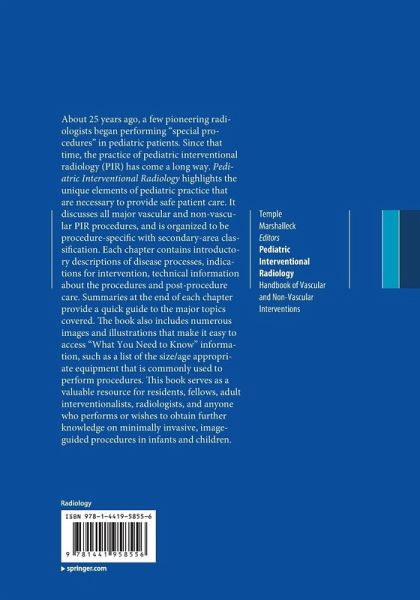 The introductory section of the book will highlight the unique elements of pediatric practice that are necessary to provide safe patient care. The remainder of the book will discuss all major vascular and non-vascular PIR procedures. The organization will be procedure specific with secondary area classification.