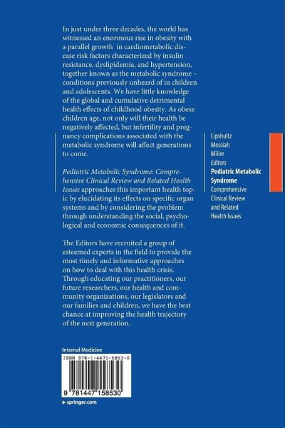 Pediatric Metabolic Syndrome: Comprehensive Clinical Review and Related Health Issues approaches the pediatric metabolic syndrome by elucidating its effects on specific organ systems and by considering the problem through understanding the social, psychological and economic consequences of it. The Editors have recruited an invited group of esteemed experts in the fieldto provide the most timely and informative approaches on how to deal with this health crisis. Through educating our practitioners, our future researchers, our health and community organizations, our legislators and our families and children, we have the best chance at improving the health trajectory of the next generation.