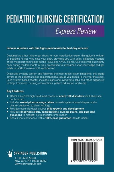 Improve retention with this high-speed review for test-day success! Designed as a last-minute gut check for your certification exam, this guide is written by pediatric nurses who have your back, providing you with quick, digestible nuggets of the most pertinent topics on the PNCB and ANCC exams. Use this small but mighty book during the last month of your preparation to strengthen your knowledge and get ready to tackle the exam with confidence! Organized by body system and following the most recent exam blueprints, this guide covers all the pediatric topics and professional issues you’ll need to know for the exam. Each system-based chapter includes signs and symptoms, labs and other diagnostic testing, treatment, nursing interventions, patient education, and more. Key Features: * Offers a succinct high-yield rapid review of nearly 100 disorders you’ll likely see on the exam * Includes useful pharmacology tables for each system-based chapter and a dedicated chapter to pharmacology * Provides essential details about child growth and development * Provides important alerts, complications, nursing pearls, and pop quiz questions to highlight extra-important information * Boosts your confidence with a 100% pass guarantee CPN® is a registered trademark of the Pediatric Nursing Certification Board (PNCB), and PED-BC™ is a registered trademark of the American Nurses Credentialing Center (ANCC). PNCB and ANCC do not sponsor or endorse this resource, nor do they have a proprietary relationship with Springer Publishing Company.