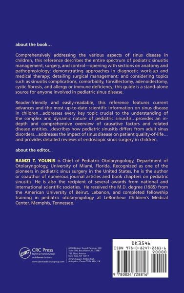 Embryology and Anatomy of the Nose and Paranasal Sinuses. Pathophysiology and Etiology of Pediatric Rhinosinusitis. Diagnostic Work-up for Pediatric Rhinosinusitis. Adult vs. Pediatric Sinusitis. Sinusitis and Its Complications. Pediatric Sinusitis and Comorbidities. Pediatric Allergy and Sinusitis. Immune Deficiency/Disorders and Pediatric Sinusitis. Cystic Fibrosis and Sinusitis. Medical Treatment of Rhinosinusitis in Infants and Children. Functional Endonasal Sinus Surgery in Pediatric Patients. The Role of Computer assisted surgery (Navigators) in Endoscopic Sinus Surgery. A Stepwise Approach to Endoscopic Surgery for Advanced Sinonasal Disease. Role of Tonsils and Adenoids in Pediatric Sinusitis. Complications of Sphenoid Sinus Surgery. How to Set up a Sinus Center