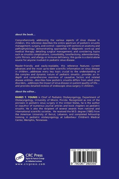 Embryology and Anatomy of the Nose and Paranasal Sinuses. Pathophysiology and Etiology of Pediatric Rhinosinusitis. Diagnostic Work-up for Pediatric Rhinosinusitis. Adult vs. Pediatric Sinusitis. Sinusitis and Its Complications. Pediatric Sinusitis and Comorbidities. Pediatric Allergy and Sinusitis. Immune Deficiency/Disorders and Pediatric Sinusitis. Cystic Fibrosis and Sinusitis. Medical Treatment of Rhinosinusitis in Infants and Children. Functional Endonasal Sinus Surgery in Pediatric Patients. The Role of Computer assisted surgery (Navigators) in Endoscopic Sinus Surgery. A Stepwise Approach to Endoscopic Surgery for Advanced Sinonasal Disease. Role of Tonsils and Adenoids in Pediatric Sinusitis. Complications of Sphenoid Sinus Surgery. How to Set up a Sinus Center