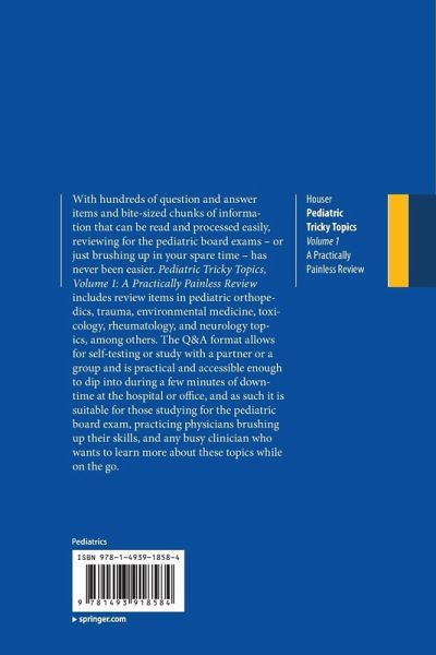 With hundreds of question and answer items and bite-sized chunks of information that can be read and processed easily, reviewing for the pediatric board exams - or just brushing up in your spare time - has never been easier. Pediatric Tricky Topics, Volume 1: A Practically Painless Review includes review items in pediatric orthopedics, trauma, environmental medicine, toxicology, rheumatology, and neurology topics, among others. The Q&A format allows for self-testing or study with a partner or a group and is practical and accessible enough to dip into during a few minutes of downtime at the hospital or office, and as such it is suitable for those studying for the pediatric board exam, practicing physicians brushing up their skills, and any busy clinician who wants to learn more about these topics while on the go.