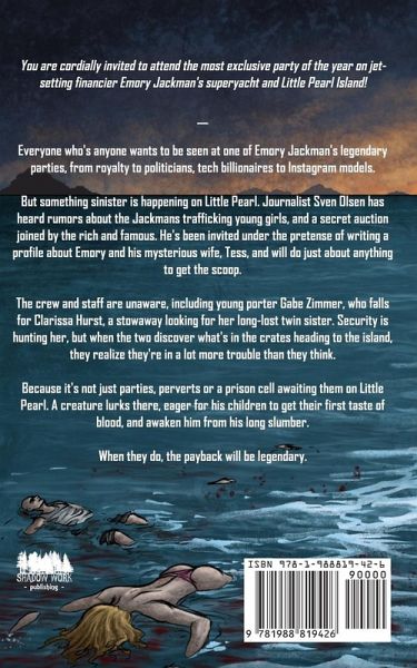 You are cordially invited to join jet-setting financier/philanthropist Emory Jackman and his very special guests at the world's most exclusive party on Little Pearl Island! __ Everyone who's anyone wants to be seen at one of Emory Jackman's legendary parties, from royalty to politicians, tech billionaires to Instagram models. But something sinister is happening on Little Pearl. Journalist Sven Olsen has heard rumors about the Jackmans trafficking young girls, and a secret auction joined by the rich and famous. He's been invited under the pretense of writing a profile about Emory and his mysterious wife, Tess, and will do just about anything to get the scoop. The crew and staff are unaware, including young porter Gabe Zimmer, who falls for Clarissa Hurst, a stowaway looking for her long-lost twin sister. Security is hunting her, but when the two discover what's in the crates heading to the island, they realize they're in a lot more trouble than they think. Because it's not just parties, perverts or a prison cell awaiting them on Little Pearl. A creature lurks there, eager for his children to get their first taste of blood, and awaken him from his long slumber. When they do, the payback will be legendary.