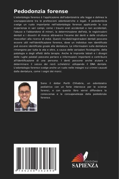 L'odontologia forense è l'applicazione dell'odontoiatria alla legge e delinea la sovrapposizione tra le professioni odontoiatriche e legali. Il pedodontista svolge un ruolo importante nell'odontologia forense applicando la sua esperienza in vari campi, come i traumi orali accidentali o non accidentali, l'abuso e l'abbandono di minori, la determinazione dell'età, le registrazioni dentali e i disastri di massa attraverso l'esame dei denti e delle strutture mascellari alla ricerca di indizi. Questi risultati/registrazioni dentali possono essere utili nell'identificazione forense, dove un individuo non identificato può essere identificato grazie alla dentatura. Le informazioni sulla dentatura rimangono per tutta la vita e oltre, a causa delle variazioni fisiologiche, della patologia e degli effetti della terapia. Anche le impronte labiali e i disegni delle rughe palatali possono portare a informazioni importanti e contribuire all'identificazione di una persona. I denti possono anche aiutare a determinare il sesso dei resti scheletrici utilizzando il DNA dentale. L'odontologia forense svolge anche un ruolo nelle indagini sui crimini causati dalla dentatura, come i segni dei morsi.