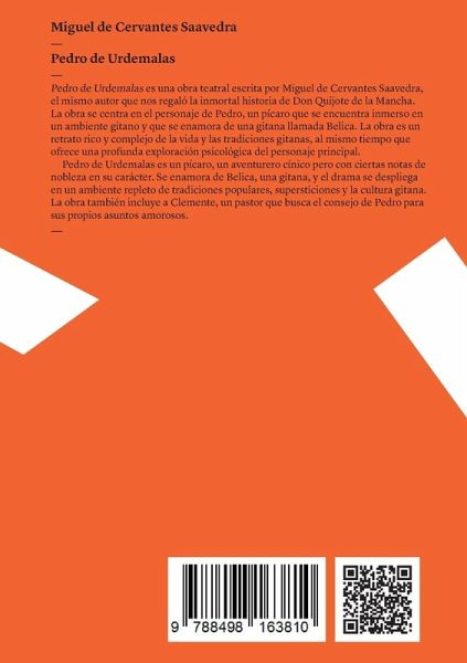 Pedro de Urdemalas es una obra teatral escrita por Miguel de Cervantes Saavedra, el mismo autor que nos regaló la inmortal historia de Don Quijote de la Mancha. La obra se centra en el personaje de Pedro, un pícaro que se encuentra inmerso en un ambiente gitano y que se enamora de una gitana llamada Belica. La obra es un retrato rico y complejo de la vida y las tradiciones gitanas, al mismo tiempo que ofrece una profunda exploración psicológica del personaje principal. Pedro de Urdemalas es un pícaro, un aventurero cínico pero con ciertas notas de nobleza en su carácter. Se enamora de Belica, una gitana, y el drama se despliega en un ambiente repleto de tradiciones populares, supersticiones y la cultura gitana. La obra también incluye a Clemente, un pastor que busca el consejo de Pedro para sus propios asuntos amorosos. La obra se sumerge en la cultura gitana, mostrando sus bailes, cantos y supersticiones, lo cual resulta en un riquísimo tapiz cultural. Además, aborda temas universales como el amor, la complejidad humana y la moralidad. Pedro es un personaje complejo que refleja las dualidades de la vida: es tanto pícaro como noble, tanto cínico como apasionado. Cervantes utiliza un lenguaje que es a la vez coloquial y poético, lo que permite una inmersión completa en la época y el ambiente que retrata. La estructura de la obra, dividida en "jornadas" o actos, permite el desarrollo gradual de los personajes y la trama, lo que añade una dimensión de realismo y profundidad a la historia. Pedro de Urdemalas es una obra que destaca por su habilidad para mezclar lo cómico con lo trágico, lo mundano con lo sublime. Aunque no es tan conocida como "Don Quijote", esta obra contribuye al legado de Cervantes como uno de los grandes maestros de la literatura universal. Además, ofrece un vistazo a las actitudes y percepciones de la época hacia la comunidad gitana, lo que la convierte en un texto de interés tanto literario como histórico. Pedro de Urdemalas es una obra fascinante que combina elementos de la comedia, el drama y la picaresca para crear un retrato complejo y matizado de su protagonista y del mundo en que vive. Con su rica textura cultural y su profunda humanidad, esta obra es una adición valiosa al canon de la literatura española y ofrece una visión única de la cultura gitana y de los dilemas morales y emocionales de la vida.