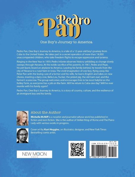 Pedro Pan, One Boy's Journey to America, is a tale of a 12-year-old boy's journey from Cuba to the United States. He takes part in a secret operation of more than 14,000 unaccompanied children, who take freedom flights to escape oppression and tyranny. Ringing in the New Year in 1959, Pedro Infante observes history unfolding as change slowly sweeps through Havana. In 1961, at the noble sacrifice of his parents, Pedro and Pepe, his pet lizard, board an airplane to America. Leaving his family behind, he travels from the city of Havana to a rural farm in Iowa. The vivid imagination of one boy, flying away like Peter Pan with the loving care of a farmer and his wife, he learns English and takes on new chores, meeting a dairy cow, Bella Lou, Tucker, the prized pig, the old barn owl, and the farmer's scarecrow. The group welcomes and encourages him to be most helpful on the Kelley Farm, as everyone has a job on the farm. Will he return to Cuba one day? Will he ever reunite with his family again? ¿