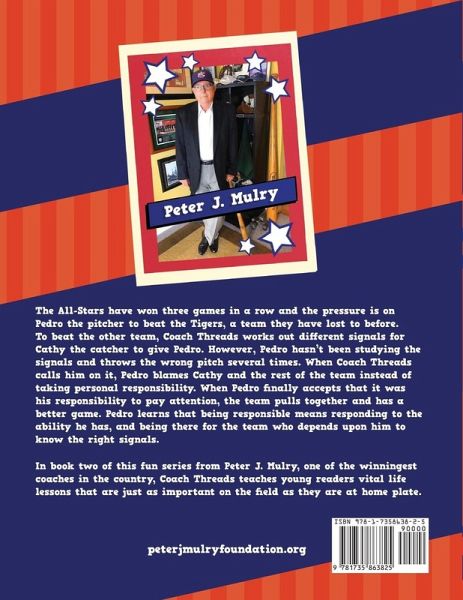 The All-Stars have won three games in a row and the pressure is on Pedro the pitcher to beat the Tigers, a team they have lost to before. To beat the other team, Coach Threads works out different signals for Cathy the catcher to give Pedro. However, Pedro hasn't been studying the signals and throws the wrong pitch several times. When Coach Threads calls him on it, Pedro blames Cathy and the rest of the team instead of taking personal responsibility. When Pedro finally accepts that it was his responsibility to pay attention, the team pulls together and has a better game. Pedro learns that being responsible means responding to the ability he has, and being there for the team who depends upon him to know the right signals. In Book Two of this fun series from Peter J. Mulry, one of the winningest coaches in the country, Coach Threads teaches young readers vital life lessons that are just as important on the field as they are at home plate.