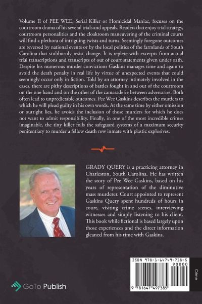 Volume II of PEE WEE, Serial Killer or Homicidal Maniac, focuses on the courtroom drama of his several trials and appeals. Readers that enjoy trial strategy, courtroom personalities, and the cloakroom maneuvering of the criminal courts will find a plethora of intriguing twists and turns. Seemingly foregone outcomes are reversed by national events or by the local politics of the farmlands of South Carolina that stubbornly resist change. It is replete with excerpts from actual trial transcriptions and transcripts of out-of-court statements given under oath. Despite his numerous murder convictions, Gaskins manages time and again to avoid the death penalty in real life by virtue of unexpected events that could seemingly occur only in fiction. Told by an attorney intimately involved in the cases, there are pithy descriptions of battles fought in and out of the courtroom on the one hand and on the other of the camaraderie between adversaries. Both often lead to unpredictable outcomes. Pee Wee Gaskins describes the murders to which he will plead guilty in his own words. At the same time by either omission or outright lies, he avoids the inclusion of those murders for which he does not want to admit responsibility. Finally, in one of the most incredible crimes imaginable, the tiny killer foils the safeguard systems of a maximum security penitentiary to murder a fellow death row inmate with plastic explosives.