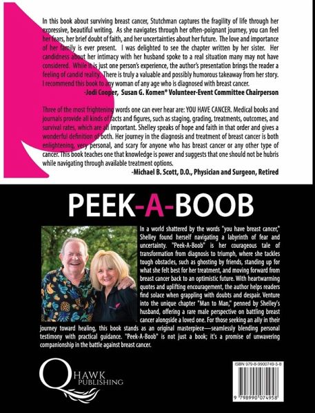If you or someone you know has ever received a breast cancer diagnosis, you understand how overwhelming and scary it can be. In "PEEK-A-BOOB," the author offers a helping hand to those navigating the difficult journey from diagnosis to survivorship. Drawing from personal experience and thorough research, this book provides a roadmap through the maze of treatment protocols and medical jargon while also serving as a source of comfort and inspiration. With heartwarming quotes and uplifting encouragement, the author helps readers find solace when grappling with doubts and despair. "PEEK-A-BOOB" is a companion, guide, and testament to the resilience of the human spirit. This is the book the author wishes she had when she heard her doctor say, "You have breast cancer." "In this book about surviving breast cancer, Stutchman captures the fragility of life through her expressive, beautiful writing. As she navigates through her often-poignant journey, you can feel her fears, her brief doubt of faith, and her uncertainties about her future. The love and importance of her family is ever present. I was delighted to see the chapter written by her sister. Her candidness about her intimacy with her husband spoke to a real situation many may not have considered. While it is just one person's experience, the author's presentation brings the reader a feeling of candid reality. There is truly a valuable and possibly humorous takeaway from her story. I recommend this book for any woman, at any age, who is diagnosed with breast cancer." ---Jodi Cooper, Susan G. Komen® Volunteer-Event Committee Chairperson "Three of the most frightening words one can ever hear are: YOU HAVE CANCER. Medical books and journals provide all kinds of facts and figures, such as staging, grading, treatments, outcomes, and survival rates, which are all important. In this well-written book, Shelley Malicote Stutchman shares her feelings and experiences, from the first suspicious mammogram to ringing the cancer-free bell with her fiancé. This was followed by the whys, the what ifs, and worries of cancer recurrence. Shelley speaks of hope and faith in that order and gives a wonderful definition of both. Her journey in the diagnosis and treatment of breast cancer is both enlightening, very personal, and scary for anyone who has breast cancer or any other type of cancer. Shelley explains how her treatment was multifaceted to include physical, mental, social, emotional, and spiritual experiences. In the last chapter, the male perspective is given. Early diagnosis and treatment are the best keys to survival in this all too common and dreaded disease. This book teaches one that knowledge is power and suggests that one should not be hubris while navigating through available treatment options." ---Michael B. Scott, D.O., Physician and Surgeon, Retired