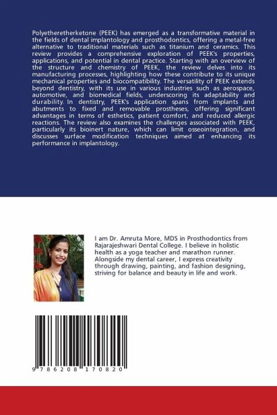 Polyetheretherketone (PEEK) has emerged as a transformative material in the fields of dental implantology and prosthodontics, offering a metal-free alternative to traditional materials such as titanium and ceramics. This review provides a comprehensive exploration of PEEK's properties, applications, and potential in dental practice. Starting with an overview of the structure and chemistry of PEEK, the review delves into its manufacturing processes, highlighting how these contribute to its unique mechanical properties and biocompatibility. The versatility of PEEK extends beyond dentistry, with its use in various industries such as aerospace, automotive, and biomedical fields, underscoring its adaptability and durability. In dentistry, PEEK's application spans from implants and abutments to fixed and removable prostheses, offering significant advantages in terms of esthetics, patient comfort, and reduced allergic reactions. The review also examines the challenges associated with PEEK, particularly its bioinert nature, which can limit osseointegration, and discusses surface modification techniques aimed at enhancing its performance in implantology.