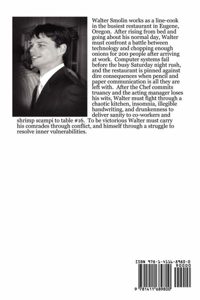 Walter Smolin works as a line-cook in the busiest restaurant in Eugene, Oregon. After rising from bed and going about his normal day, Walter must confront a battle between technology and chopping enough onions for 200 people after arriving at work. Computer systems fail before the busy Saturday night rush, and the restaurant is pinned against dire consequences when pencil and paper communication is all they are left with. After the Chef commits truancy and the acting manager loses his wits, Walter must fight through a chaotic kitchen, insomnia, illegible handwriting, and drunkenness to deliver sanity to co-workers and shrimp scampi to table #16. To be victorious Walter must carry his comrades through conflict, and himself through a struggle to resolve inner vulnerabilities.
