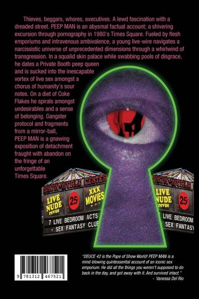 Thieves, beggars, whores, executives. A lewd fascination with a dreaded street. PEEP MAN is an abysmal factual account; a shivering excursion through pornography in 1980's Times Square. Fueled by flesh emporiums and intravenous ambivalence, a young live-wire navigates a narcissistic universe of unprecedented dimensions through a whirlwind of transgression. In a squalid skin palace while swabbing pools of disgrace, he dates a Private Booth peep queen and is sucked into the inescapable vortex of live sex amongst a chorus of humanity's sour notes. On a diet of Coke Flakes he spirals amongst undesirables and a sense of belonging. Gangster protocol and fragments from a mirror-ball, PEEP MAN is a gnawing exposition of detachment fraught with abandon on the fringe of an unforgettable Times Square.