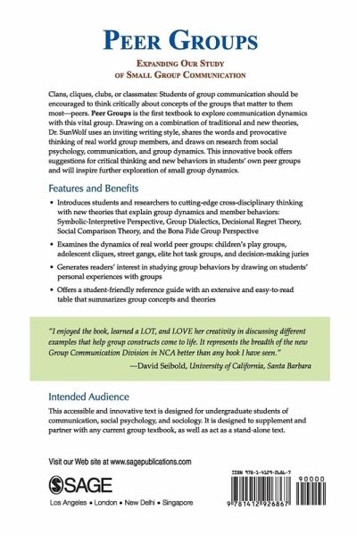 Clans, cliques, clubs, or classmates: Students of group communication should be encouraged to think critically about concepts to the groups that matter to them most-peers. Peer Groups is the first textbook to explore group communication dynamics with this vital group. Drawing on a combination of traditional and new theories, Dr. SunWolf uses an inviting writing style, shares the words and provocative thinking of real world group members, and draws on research from social psychology, communication, and group dynamics. This innovative book offers suggestions for critical thinking and new behaviors in students' own peer groups and will inspire further exploration of small group dynamics.