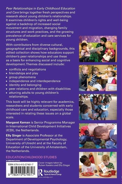 Peer Relationships in Early Childhood Education and Care brings together fresh perspectives and research about young children's relationships. It examines children's rights and well-being against a backdrop of increased social movement and migration, changing family structures and work practices, and the growing prevalence of education and care services for young children. With contributors from diverse cultural, geographical and disciplinary backgrounds, this edited collection shows how educators support children's peer relationships and use these as a basis for enhancing social and cognitive development. Themes discussed include: conflicts and negotiations friendships and play group phenomena independence and interdependence identity and belonging peer relations and children with disabilities attuning adults to young children's relationships. This book will be highly relevant for academics, researchers and students concerned with early childhood care and education, especially those interested in relating these issues on a global scale.