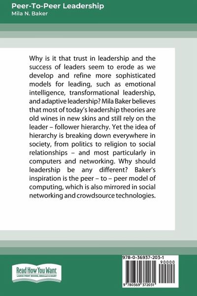 Why is it that trust in leadership and the success of leaders seem to erode as we develop and refine more sophisticated models for leading, such as emotional intelligence, transformational leadership, and adaptive leadership? Mila Baker believes that most of today's leadership theories are old wines in new skins and still rely on the leader - follower hierarchy. Yet the idea of hierarchy is breaking down everywhere in society, from politics to religion to social relationships - and most particularly in computers and networking. Why should leadership be any different? Baker's inspiration is the peer - to - peer model of computing, which is also mirrored in social networking and crowdsource technologies. Baker shows that a network with ''equipotent'' nodes of power - think peer leaders - is infinitely more powerful than a ''client - server'' (i.e., leader - follower) network. Yet the typical organizational design still harkens back to the days of punch - card computers. By creating organizations with leaders at all levels, architects of peer - to - peer organizations can build flexibility, resiliency, and accountability. Baker still advocates the need for top - level executives and senior leaders but advises them to give up traditional notions of power and become focused on maintaining the health of the network rather than achieving personal leadership goals. Companies such as Gore and Herman Miller practice these principles and have achieved long - term success - Baker provides a structure to this approach that any organization can adapt.