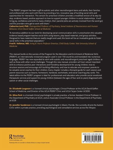 This manual builds on the success of the Program for the Education and Enrichment of Relational Skills (PEERS®), an internationally renowned program used in over 150 countries and translated into numerous languages. PEERS® has now expanded to work with autistic and neurodivergent preschool-aged children, as well as those with other social challenges. Through this new manual, providers will learn about important skills to enhance positive peer interactions and friendship development for young children, how to structure sessions and encourage skill-building effectively, and how to educate and empower parents to be valuable social coaches for their children. Every chapter includes a therapist guide for each session and parent resources such as lessons, homework, handouts, worksheets, and social coaching play cards. This latest edition to the PEERS® program is ideal for professionals and educators who provide social-emotional therapeutic services and support to young children (between the ages of four to six years) diagnosed with autism or other social challenges.