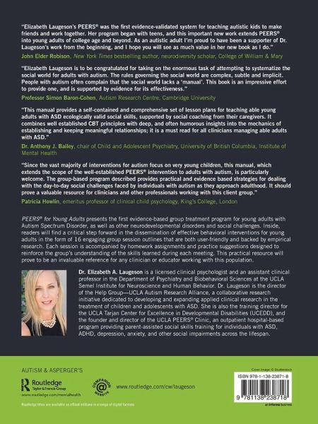 PEERS® for Young Adults presents the first evidence-based group treatment program for young adults with Autism Spectrum Disorder, as well as other neurodevelopmental disorders and social challenges. Inside, readers will find a critical step forward in the dissemination of effective behavioral interventions for young adults in the form of 16 engaging group session outlines that are both user-friendly and backed by empirical research. Each session is accompanied by homework assignments and practice suggestions designed to reinforce the group's understanding of the skills learned during each meeting. This practical resource will prove to be an invaluable reference for any clinician or educator working with this population.