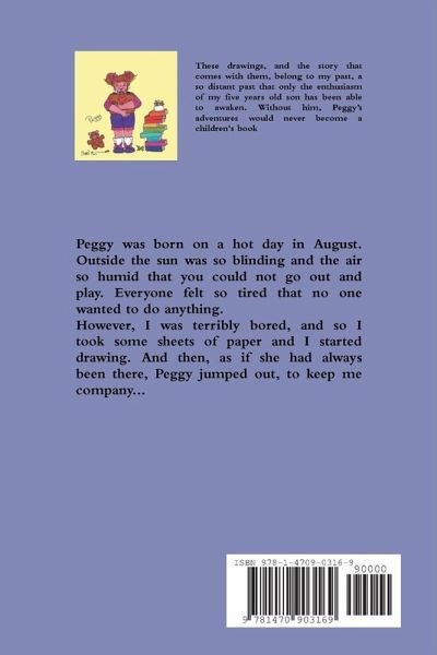 Illustrated book with color illustrations. A tender story for children that comes with lovely and simple drawings that immediately capture the interest of your children and encourage them to dream together with Peggy, the pretty protagonist of these adventures... These drawings, and the story that comes with them, belong to the author's past, a so distant past that only the enthusiasm of her five years old son has been able to awaken. Without him, Peggy's adventures would never become a children's book.