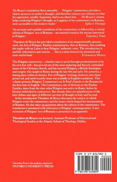 The Pelagian controversy has secured an enduring place for Pelagius in the history of Western Christian thought. Few of Pelagius' writings, however, have been preserved, and until recently none was available in English translation. This volume presents Pelagius' commentary on Romans for the first time in English. The commentary, one of thirteen on the Pauline epistles, dates from the time when Pelagius was active in Rome, before he became embroiled in controversy, but already there are adumbrations of the later debate and signs of different currents of thought in Italy and beyond. In his introduction Theodore de Bruyn discusses the context in which Pelagius wrote the commentary and the issues which shaped his interpretation of Romans. He also takes up questions about the edition of the commentary. The translation is annotated with references to Pelagius' contemporaries, and a new recension of Pelagius' text of Romans is presented in an appendix.