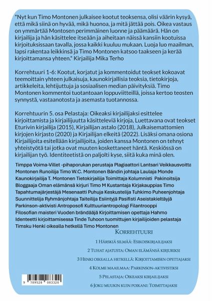 TIMO MONTONEN KORREHTUURI: KOOTUT, KORJATUT JA KOMMENTOIDUT TEOKSET 1 HÄRSKIÄ SILMÄÄ: ESIKOISKIRJAILIJAKSI 2 TUHAT AJATUSTA: OMAN ELÄMÄNSÄ KIRJURIKSI 3 HENKI OIKEALLA HETKELLÄ: KIRJOITTAMISEN OPETTAJAKSI 4 KOLME MAAILMAA: PARKINSON-AKTIVISTIKSI 5 PELASTAJA: OIKEAKSI KIRJAILIJAKSI 6 JOKU MUUKIN KUIN POIKANI: TOIMITTAJAKSI HAISTATTELUNI KUMPUSI TIEDOSTAMATTOMAN UUMENISTA "Nyt kun Timo Montonen julkaisee kootut teoksensa, olisi väärin kysyä, että mikä siinä on hyvää, mikä huonoa, ja mitä jättää pois. Oikea vastaus on ymmärtää Montosen perimmäinen luonne ja päämäärä. Hän on kirjailija ja hän käsittelee itseään ja aiheitaan näissä kansiin kootuissa kirjoituksissaan tavalla, jossa kaikki kuuluu mukaan. Luoja luo maailman, lapsi rakentaa leikkinsä ja Timo Montonen katsoo taakseen ja kerää kirjoittamansa yhteen." Kirjailija Mika Terho Korrehtuuri 1-6: Kootut, korjatut ja kommentoidut teokset kokoavat teemoittain yhteen julkaisuja, kaunokirjallisia teoksia, tietokirjoja, artikkeleita, lehtijuttuja ja sosiaalisen median päivityksiä. Timo Montonen kommentoi tuotantoaan loppuviitteillä, joissa kertoo teosten synnystä, vastaanotosta ja asemasta tuotannossa. Korrehtuurin 5. osa Pelastaja: Oikeaksi kirjailijaksi esittelee kirjoittamista ja kirjailijuutta käsitteleviä kirjoja, Luettavana ovat teokset Eturivin kirjailija (2015), Kirjailijan astalo (2018), Julkaisemattomien kirjojen kirjasto (2020) ja Kirjailijan elkeitä (2022). Lisäksi omana osiona Kirjailijoita esitellään kirjailijoita, joiden kanssa Montonen on tehnyt yhteistyötä tai jotka ovat muuten koskettaneet häntä. Keskiössä on kirjailijan työ. Identiteetistä on paljolti kyse, siitä kuka minä olen. On kyse rooleista, siitä mikä minä olen. Ja on kyse minäkuvasta, siitä kuinka minä olen minä ja kuinka näyttelen kaikki roolini. Timo Montonen kirjoittaa esipuheessa: "Ei ole ollut silmiinpistävää eroa, olenko vakavin mielin kirjoittanut esikoisteostani Sinisilmää Merihaassa upouudessa opiskelija-asunnossamme vailla muuta työsuhdetta kuin ajoittainen äitini auttaminen Hakaniemen hallin ja torin kukkamyymälöissä tai olenko kirjoittanut toista romaaniani Kahtatoista aamua Karjaalla 90-luvun alun lamaa hyväksikäyttäen vailla pelkoa pakkotyöllistymisestä. - - Aina toimeenpanevana voimana on ollut sama itsestä kumpuava pitelemätön luovuus, pakko loihtia mielessä nähty konkreettisiksi sanoiksi, kuviksi, teoiksi."
