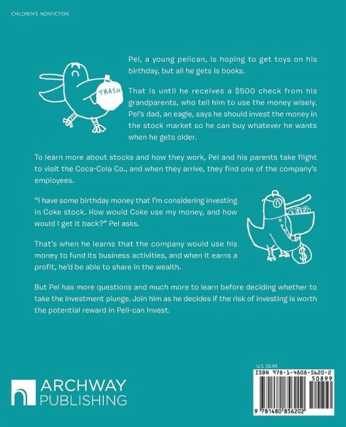 Pel, a young pelican, is hoping to get toys on his birthday, but all he gets is books. That is until he receives a $500 check from his grandparents, who tell him to use the money wisely. Pel's dad, an eagle, says he should invest the money in the stock market so he can buy whatever he wants when he gets older. To learn more about stocks and how they work, Pel and his parents take flight to visit the Coca-Cola Co., and when they arrive, they find one of the company's employees. "I have some birthday money that I'm considering investing in Coke stock. How would Coke use my money, and how would I get it back?" Pel asks. That's when he learns that the company would use his money to fund its business activities, and when it earns a profit, he'd be able to share in the wealth. But Pel has more questions and much more to learn before deciding whether to take the investment plunge. Join him as he decides if the risk of investing is worth the potential reward in Peli-can Invest.