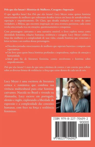 Pelo que elas lutam?: Histórias de Mulheres, Coragem e Superação O que significa lutar? Em Pelo que elas lutam?, Lucy Meyer reúne quinze histórias emocionantes de mulheres que enfrentam desafios únicos em busca de autodescoberta, superação e empoderamento. De Clara, que desafia tradições em nome do amor verdadeiro, a Milena, que encontra inspiração em uma aventura parisiense, cada conto revela uma jornada rica em emoções, questionamentos e conquistas. Com personagens cativantes e uma narrativa sensível, o livro explora temas como identidade feminina, relações humanas, resiliência e coragem. Lucy Meyer celebra a força das mulheres e a complexidade de suas vidas, criando histórias que conectam o leitor às lutas e aos sonhos dessas personagens.Descubra jornadas emocionantes de mulheres que superam barreiras e rompem com expectativas. Um livro para quem busca histórias profundas e inspiradoras, repletas de emoção e humanidade. Ideal para fãs de literatura feminina, contos envolventes e histórias sobre empoderamento. Pelo que elas lutam? é mais do que uma coletânea de contos; é um convite para refletir sobre as diversas formas de resiliência e a força que existe dentro de cada um de nós.