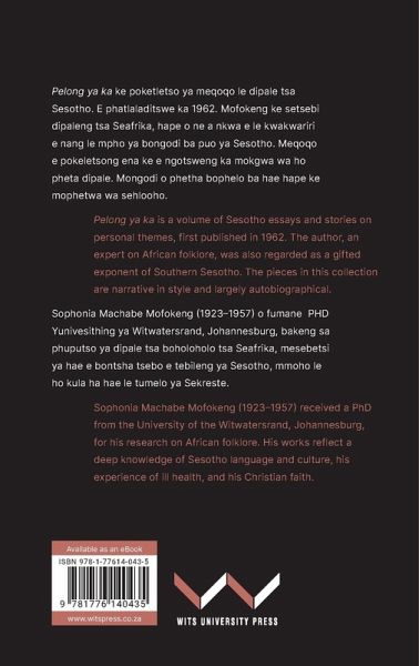 Pelong ya Ka, a collection of essays and sketches in Sotho was first published in 1962 in the Bantu Treasury Series imprint of Witwatersrand University Press. S. Machabe Mofokeng is regarded as one of the greatest essayist and dramatist in Southern Sotho. His first book, Senkatana (a play) was published in 1952. Pelong ya Ka comprises 20 essays which range from meditative, descriptive, and narrative to polemic style, with the tone of voice characterised by melancholy, humour, and satire. The essays span over a wide range of themes, as suggested by their titles, e.g. Pelo (The heart), Bodutu ('Solitude'), Death ('Lefu'), Nako ('Time'), Pampiri ('Paper'), Ho kganna mmotokara ('Driving an automobile'), Sepetlele ('Hospital'), Lenyalo ('Matromony'), and Boqheku ('Old age'). Nhlanhla Maake says of this collection "Mofokeng's essays fuse simplicity with dept." Pelong ya Ka is part of the African Treasury Series published by Wits University Press.