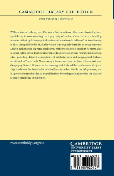 William Martin Leake (1777-1860) was a British military officer and classical scholar specialising in reconstructing the topography of ancient cities. He was a founding member of the Royal Geographical Society and was elected a Fellow of the Royal Society in 1815. First published in 1846, this volume was originally intended as a supplement to Leake's authoritative topographical survey of the Peloponnese, Travels in the Morea, also reissued in this series. The book is organised as a series of articles referencing historical sites, providing detailed descriptions of artefacts, sites and geographical features mentioned in Travels in the Morea, using information from the French Commission of Geography, Natural History and Archaeology which visited the area between 1829 and 1831. Leake was the first scholar to identify many ancient sites in the Peloponnese, and his precise observations led to his publications becoming authoritative for the classical archaeological sites of the region.