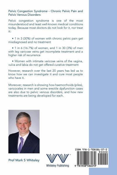 Pelvic Congestion Syndrome – Chronic Pelvic Pain and Pelvic Venous Disorders: Pelvic congestion syndrome is one of the most misunderstood and least well-known medical conditions today. Because doctors most do not look for it, nor treat it: 1 in 3 (30%) of women with chronic pelvic pain get misdiagnosed and no treatment 1 in 6 (16.7%) of women and 1 in 30 (3%) of men with leg varicose veins get incomplete treatment and a higher risk of recurrence Women with intimate varicose veins of vagina, vulva, and labia do not get offered curative treatment However, research over the last 20 years has led us to know how we can investigate it and cure most people who have it. Moreover, research is showing how hemorrhoids (piles), varicocele in men and some erectile dysfunction are also due to pelvic venous disorders, and how new treatments are being developed for each. Pelvic Congestion Syndrome – Chronic Pelvic Pain and Pelvic Venous Disorders explains the concepts, the veins, how they go wrong to cause the problem - and how specialists at The Whiteley Clinic have spent 20 years developing the optimal investigations and treatments for this condition. This book is aimed at both the public and health care professionals who want to know more about this fascinating condition that affects millions of women and men in the world today.