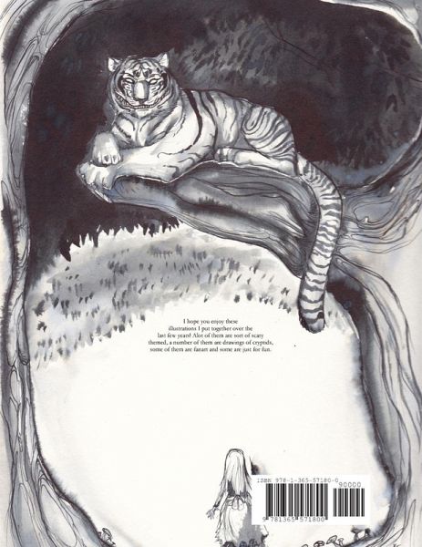 This book is 61 pages of illustrations and drawings I've done in brush and quill and ink over the last few years. A lot of them are horror type illustrations, some of them are pictures of particular cryptids like the Mothman, Fresno Crawler, werewolves and others. There's also a healthy sprinkling of Alice in Wonderland art and other miscellaneous pictures.