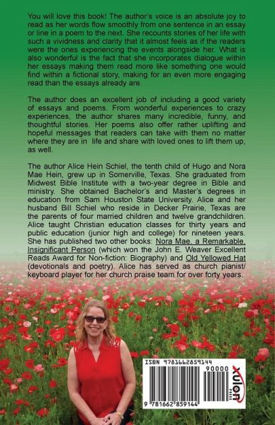 You will love this book! The author's voice is an absolute joy to read as her words flow smoothly from one sentence in an essay or line in a poem to the next. She recounts stories of her life with such a vividness and clarity that it almost feels as if the readers were the ones experiencing the events alongside her. What is also wonderful is the fact that she incorporates dialogue within her essays making them read more like something one would find within a fictional story, making for an even more engaging read than the essays already are. The author does an excellent job of including a good variety of essays and poems. From wonderful experiences to crazy experiences, the author shares many incredible, funny, and thoughtful stories. Her poems also offer rather uplifting and hopeful messages that readers can take with them no matter where they are in life and share with loved ones to lift them up, as well. The author Alice Hein Schiel, the tenth child of Hugo and Nora Mae Hein, grew up in Somerville, Texas. She graduated from Midwest Bible Institute with a two-year degree in Bible and ministry. She obtained Bachelor's and Master's degrees in education from Sam Houston State University. Alice and her husband Bill Schiel who reside in Decker Prairie, Texas are the parents of four married children and twelve grandchildren. Alice taught Christian education classes for thirty years and public education (junior high and college) for nineteen years. She has published two other books: Nora Mae, a Remarkable, Insignificant Person (which won the John E. Weaver Excellent Reads Award for Non-fiction: Biography) and Old Yellowed Hat (devotionals and poetry). Alice has served as church pianist/keyboard player for her church praise team for over forty years.