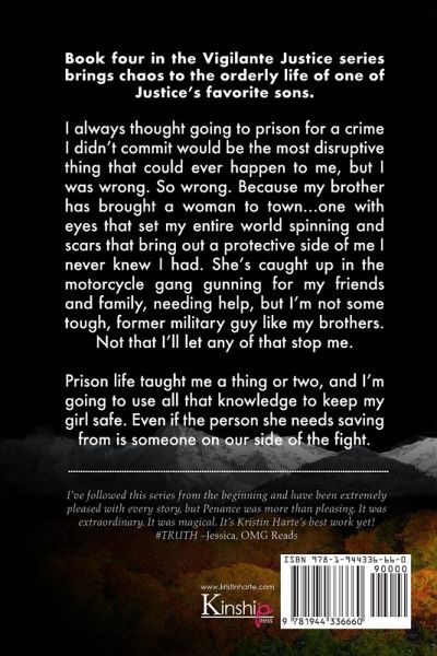 Book four in the Vigilante Justice series brings chaos to the orderly life of one of Justice's favorite sons. I always thought going to prison for a crime I didn't commit would be the most disruptive thing that could ever happen to me, but I was wrong. So wrong. Because my brother has brought a woman to town...one with eyes that set my entire world spinning and scars that bring out a protective side of me I never knew I had. She's caught up in the motorcycle gang gunning for my friends and family, needing help, but I'm not some tough, former military guy like my brothers. Not that I'll let any of that stop me. Prison life taught me a thing or two, and I'm going to use all that knowledge to keep my girl safe. Even if the person she needs saving from is someone on our side of the fight.