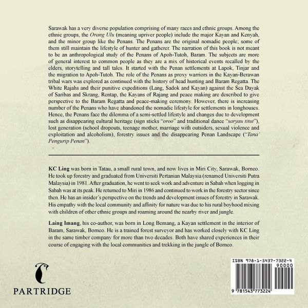 Sarawak has a very diverse population comprising of many races and ethnic groups. Among the ethnic groups, the Orang Ulu (meaning upriver people) include the major Kayan and Kenyah, and the minor group like the Penans. The Penans are the original nomadic people; some of them still maintain the lifestyle of hunter and gatherer. The narration of this book is not meant to be an anthropological study of the Penans of Apoh-Tutoh, Baram. The subjects are more of general interest to common people as they are a mix of historical events recalled by the elders, storytelling and tall tales. It started with the Penan settlements at Lapok, Tinjar and the migration to Apoh-Tutoh. The role of the Penans as proxy warriors in the Kayan-Berawan tribal wars was explored as continued with the history of head hunting and Baram Regatta. The White Rajahs and their punitive expeditions (Lang, Sadok and Kayan) against the Sea Dayak of Saribas and Skrang, Rentap, the Kayans of Rajang and peace making are described to give perspective to the Baram Regatta and peace-making ceremony. However, there is increasing number of the Penans who have abandoned the nomadic lifestyle for settlements in longhouses. Hence, the Penans face the dilemma of a semi-settled lifestyle and changes due to development such as disappearing cultural heritage (sign sticks "oroo" and traditional dance "saryau titut"), lost generation (school dropouts, teenage mother, marriage with outsiders, sexual violence and exploitation and alcoholism), forestry issues and the disappearing Penan Landscape ("Tana' Pengurip Penan").