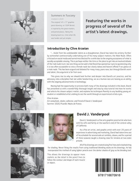 With over ten black and white graphite pencil drawings, "Pencil Drawings for mature artists", featuring the works in progress of several of the artist's latest drawings from 2018 to 2020. Unlike his earlier books which simply showcase many of his drawings up to the time of publication, this book goes into detail explaining how each drawing was created - using all lines and crosshatching and never using a traditional stump to blend the graphite.