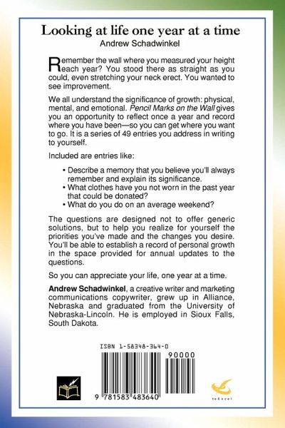 Remember the wall where you measured your height each year? You stood there as straight as you could, even stretching your neck erect. You wanted to see improvement. We all understand the significance of growth: physical, mental, and emotional. Pencil Marks on the Wall gives you an opportunity to reflect once a year and record where you have been -- so you can get where you want to go. It is a series of 49 entries you address in writing to yourself. Included are entries like: -- Describe a memory that you believe you'll always remember and explain its significance. -- What clothes have you not worn in the past year that could be donated? -- What do you do on an average weekend? The questions are designed not to offer generic solutions, but to help you realize for yourself the priorities you've made and the changes you desire. You'll be able to establish a record of personal growth in the space provided for annual updates to the questions. So you can appreciate your life, one year at a time.