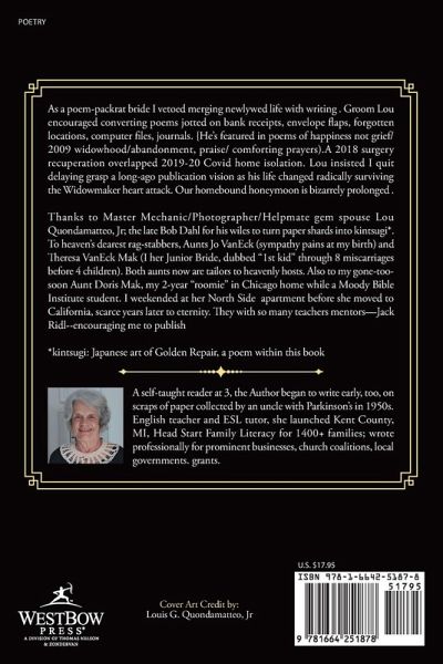 As a poem-packrat bride I vetoed merging newlywed life with writing . Groom Lou encouraged converting poems jotted on bank receipts, envelope flaps, forgotten locations, computer files, journals. {He's featured in poems of happiness not grief/ 2009 widowhood/abandonment, praise/ comforting prayers).A 2018 surgery recuperation overlapped 2019-20 Covid home isolation. Lou insisted I quit delaying grasp a long-ago publication vision as his life changed radically surviving the Widowmaker heart attack. Our homebound honeymoon is bizarrely prolonged . Thanks to Master Mechanic/Photographer/Helpmate gem spouse Lou Quondamatteo, Jr; the late Bob Dahl for his wiles to turn paper shards into kintsugi*. To heaven's dearest rag-stabbers, Aunts Jo VanEck (sympathy pains at my birth) and Theresa VanEck Mak (I her Junior Bride, dubbed "1st kid" through 8 miscarriages before 4 children). Both aunts now are tailors to heavenly hosts. Also to my gone-too-soon Aunt Doris Mak, my 2-year "roomie" in Chicago home while a Moody Bible Institute student. I weekended at her North Side apartment before she moved to California, scarce years later to eternity. They with so many teachers mentors-Jack Ridl--encouraging me to publish *kintsugi: Japanese art of Golden Repair, a poem within this book.