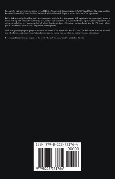 Prepare to be captivated by the mysterious town of Hillview Gardens and the gripping tale of the RIP Squad (Retired Investigators of the Paranormal) - an unlikely team of ordinary individuals who have been called upon to unravel the secrets of the supernatural. Led by Jack, a retired police officer with a keen investigative mind; Sarah, a photographer with a passion for the unexplained; Mason, a retired beat cop with a knack for technology, Theo, another tech wizard and Linda, with her forensic expertise, the RIP Squad will face their greatest challenge yet - uncovering the truth behind the enigmatic figure of Jeremiah, a tormented spirit from the 17th century whose past as a witchfinder's assistant casts a long shadow over the present. With heart-pounding suspense, poignant moments, and a touch of the inexplicable, "Pendle's Curse - The RIP Squad Chronicles" is a novel that will take you on a journey where the lines between past and present blur, and where the ordinary becomes extraordinary. If you enjoyed the mystery and suspense of the novel, "The Da Vinci Code" you'll be sure to love this one.