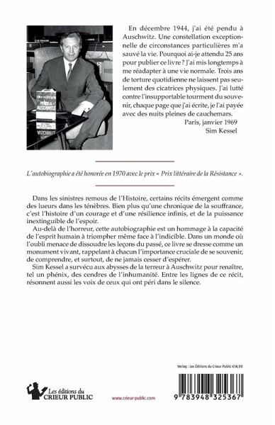 Sim Kessel, jeune Français, juif et boxeur professionnel, a écrit en 1969 son autobiographie sur les années 1940-45, décrivant comment il a survécu contre toute probabilité à Auschwitz et à d'autres camps de concentration et d'extermination du régime nazi. En 1940, immédiatement après sa démobilisation, il a rejoint en tant que soldat le mouvement de résistance français contre l'occupation allemande de la France, la Résistance. Deux ans plus tard, il fut arrêté par la Gestapo. Malgré la torture, il n'avoua rien de ses activités clandestines. En tant que juif, il fut transféré à Drancy, près de Paris, où il fut emprisonné et déporté par la suite au camp de concentration d'Auschwitz. Dans les conditions épouvantables des camps d'extermination nazis, sous le numéro 130 665, il déchargeait des matériaux de construction à Birkenau et travaillait dans les mines de Jawarzno. Complètement épuisé et malade, une simple erreur bureaucratique le sauva une première fois de la chambre à gaz. En 1943, la Gestapo du camp a de nouveau tenté de lui extorquer des aveux sur ses activités de résistance. Il a été torturé, on lui a arraché un doigt. Il fut sauvé une deuxième fois de la chambre à gaz, cette fois par un SS qui était également boxeur. Paris était libéré depuis trois mois lorsqu'il tenta de s'échapper. L'évasion échoua, il fut pendu devant 25.000 déportés. La corde s'est rompue. Cela signifiait l'assassinat par balle dans la nuque. Mais le bourreau qui devait l'abattre était également un boxeur et l'a sauvé in extremis. Le 18 janvier 1945, Auschwitz a été évacué. S'ensuivit la marche de la mort, par étapes quotidiennes de trente à quarante kilomètres, pendant treize jours, vers le camp de concentration de Mauthausen, puis vers le camp de Gusen 2. Au matin du 7 mai 1945, les déportés se retrouvèrent soudain seuls dans le camp abandonné, les Allemands ayant fui devant l'armée américaine.