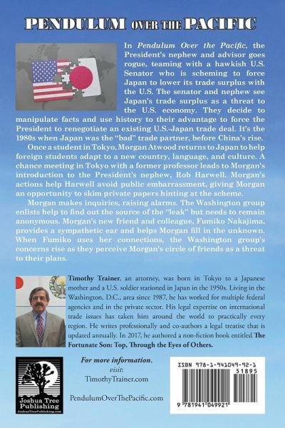 In Pendulum Over the Pacific, the President’s nephew and advisor goes rogue, teaming with a hawkish U.S. Senator who is scheming to force Japan to lower its trade surplus with the U.S. The senator and nephew see Japan’s trade surplus as a threat to the U.S. economy. They decide to manipulate facts and use history to their advantage to force the President to renegotiate an existing U.S.-Japan trade deal. It’s the 1980s when Japan was the "bad" trade partner, before China’s rise. Once a student in Tokyo, Morgan Atwood returns to Japan to help foreign students adapt to a new country, language, and culture. A chance meeting in Tokyo with a former professor leads to Morgan’s introduction to the President’s nephew, Rob Harwell. Morgan’s actions help Harwell avoid public embarrassment, giving Morgan an opportunity to skim private papers hinting at the scheme. Morgan makes inquiries, raising alarms. The Washington group enlists help to find out the source of the "leak" but needs to remain anonymous. Morgan’s new friend and colleague, Fumiko Nakajima, provides a sympathetic ear and helps Morgan fill in the unknown. When Fumiko uses her connections, the Washington group’s concerns rise as they perceive Morgan’s circle of friends as a threat to their plans.