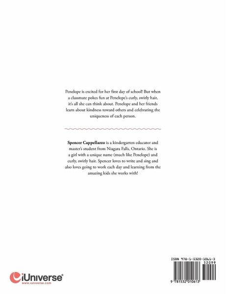Penelope is excited for her first day of school! But when a classmate pokes fun at Penelope's curly, swirly hair, it's all she can think about. Penelope and her friends learn about kindness toward others and celebrating the uniqueness of each person.