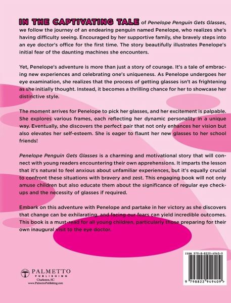 In the captivating tale of Penelope Penguin Gets Glasses, we follow the journey of an endearing penguin named Penelope, who realizes she's having difficulty seeing. Encouraged by her supportive family, she bravely steps into an eye doctor's office for the first time. The story beautifully illustrates Penelope's initial fear of the daunting machines she encounters. Yet, Penelope's adventure is more than just a story of courage. It's a tale of embracing new experiences and celebrating one's uniqueness. As Penelope undergoes her eye examination, she realizes that the process of getting glasses isn't as frightening as she initially thought. Instead, it becomes a thrilling chance for her to showcase her distinctive style. The moment arrives for Penelope to pick her glasses, and her excitement is palpable. She explores various frames, each reflecting her dynamic personality in a unique way. Eventually, she discovers the perfect pair that not only enhances her vision but also elevates her self-esteem. She is eager to flaunt her new glasses to her school friends! Penelope Penguin Gets Glasses is a charming and motivational story that will connect with young readers encountering their own apprehensions. It imparts the lesson that it's natural to feel anxious about unfamiliar experiences, but it's equally crucial to confront these situations with bravery and zest. This engaging book will not only amuse children but also educate them about the significance of regular eye check-ups and the necessity of glasses if required. Embark on this adventure with Penelope and partake in her victory as she discovers that change can be exhilarating, and facing our fears can yield incredible outcomes. This book is a must-read for all young children, particularly those preparing for their own inaugural visit to the eye doctor.