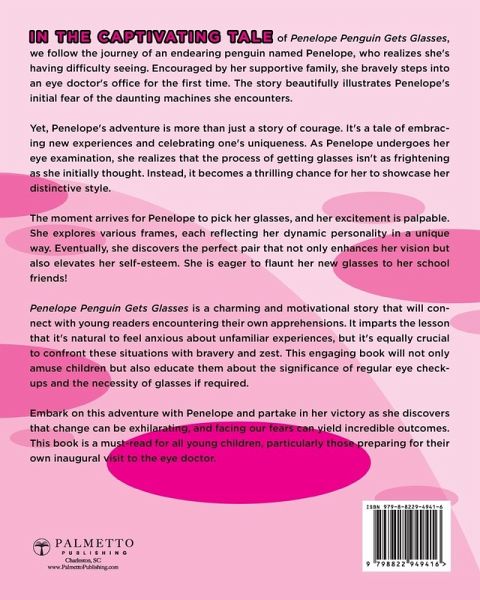 In the captivating tale of Penelope Penguin Gets Glasses, we follow the journey of an endearing penguin named Penelope, who realizes she's having difficulty seeing. Encouraged by her supportive family, she bravely steps into an eye doctor's office for the first time. The story beautifully illustrates Penelope's initial fear of the daunting machines she encounters. Yet, Penelope's adventure is more than just a story of courage. It's a tale of embracing new experiences and celebrating one's uniqueness. As Penelope undergoes her eye examination, she realizes that the process of getting glasses isn't as frightening as she initially thought. Instead, it becomes a thrilling chance for her to showcase her distinctive style. The moment arrives for Penelope to pick her glasses, and her excitement is palpable. She explores various frames, each reflecting her dynamic personality in a unique way. Eventually, she discovers the perfect pair that not only enhances her vision but also elevates her self-esteem. She is eager to flaunt her new glasses to her school friends! Penelope Penguin Gets Glasses is a charming and motivational story that will connect with young readers encountering their own apprehensions. It imparts the lesson that it's natural to feel anxious about unfamiliar experiences, but it's equally crucial to confront these situations with bravery and zest. This engaging book will not only amuse children but also educate them about the significance of regular eye check-ups and the necessity of glasses if required. Embark on this adventure with Penelope and partake in her victory as she discovers that change can be exhilarating, and facing our fears can yield incredible outcomes. This book is a must-read for all young children, particularly those preparing for their own inaugural visit to the eye doctor.